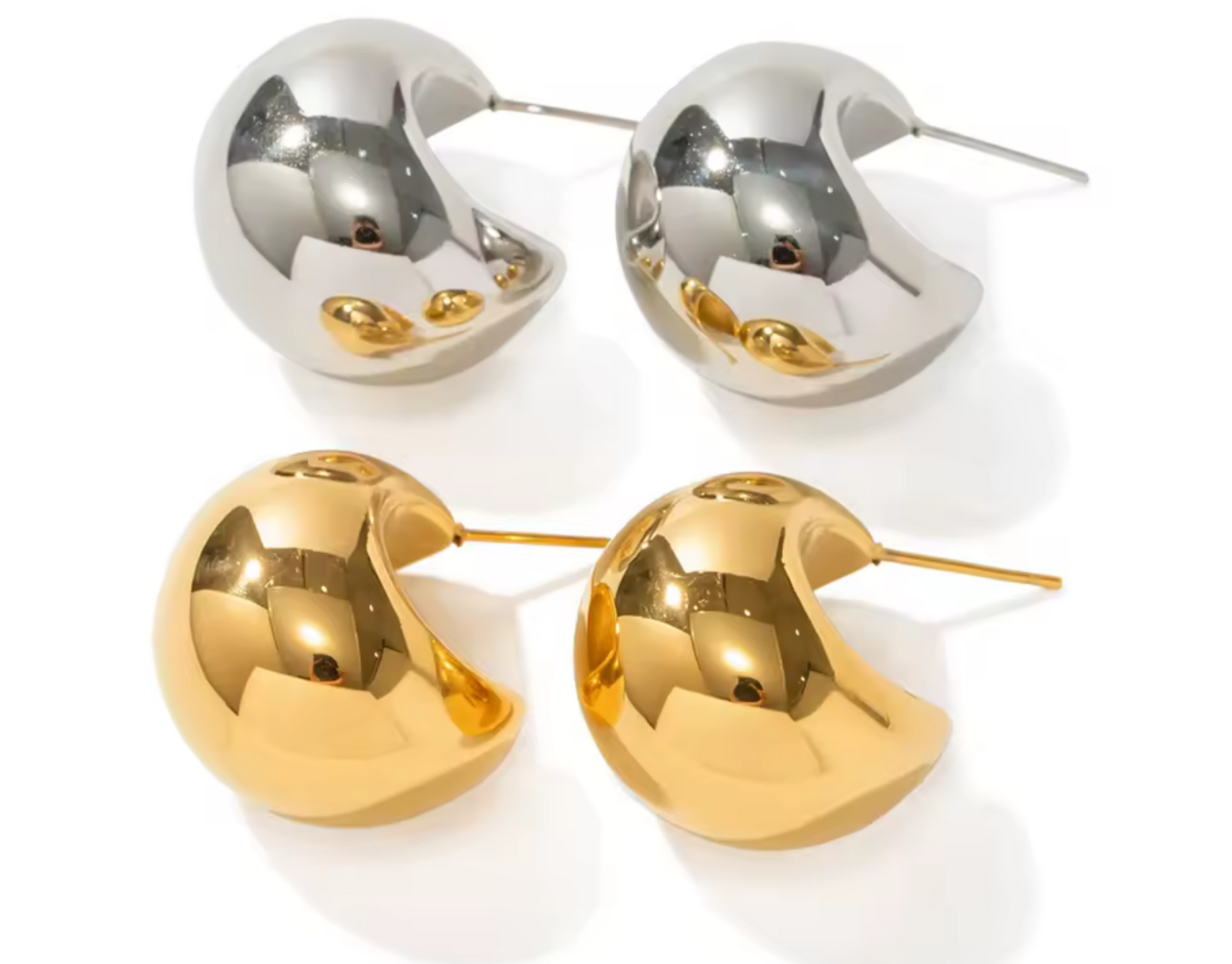 Aretes dorados y plateados de diseño curvado y liso, con acabado pulido que refleja la luz de forma elegante. Modernos, minimalistas y fáciles de llevar con cualquier look.